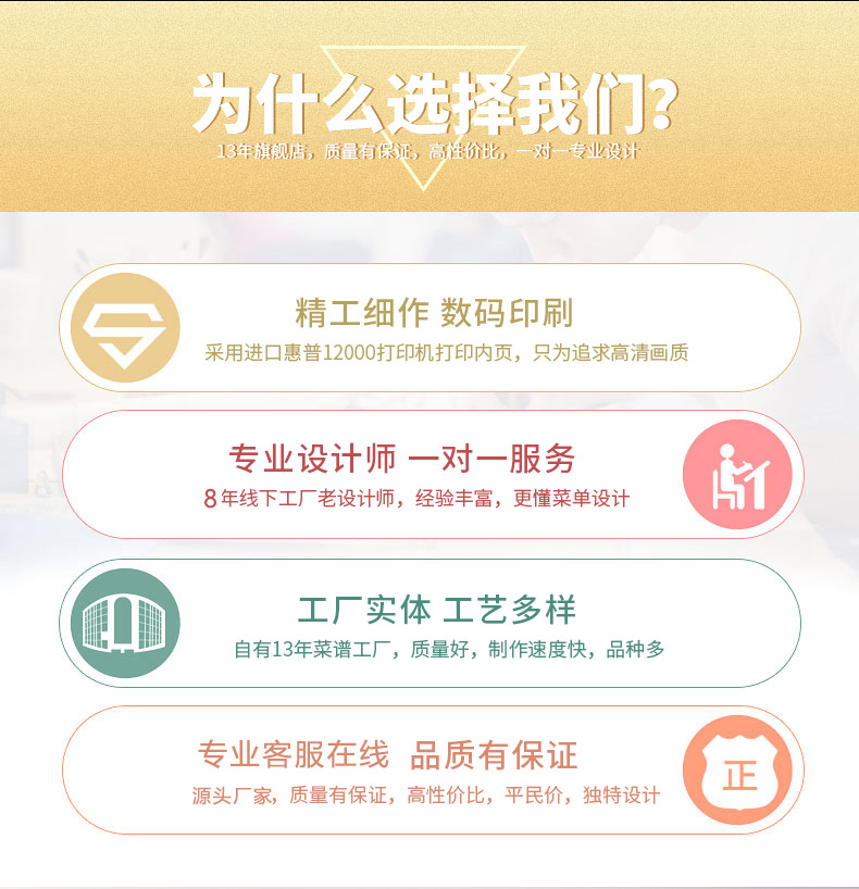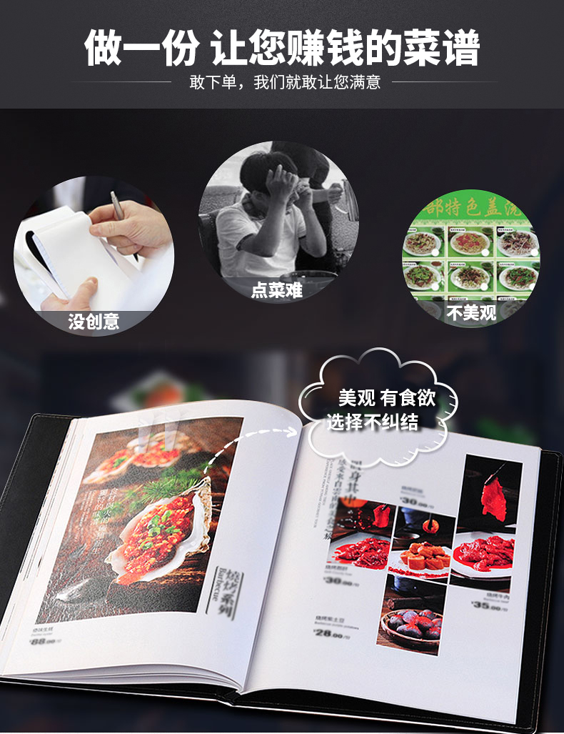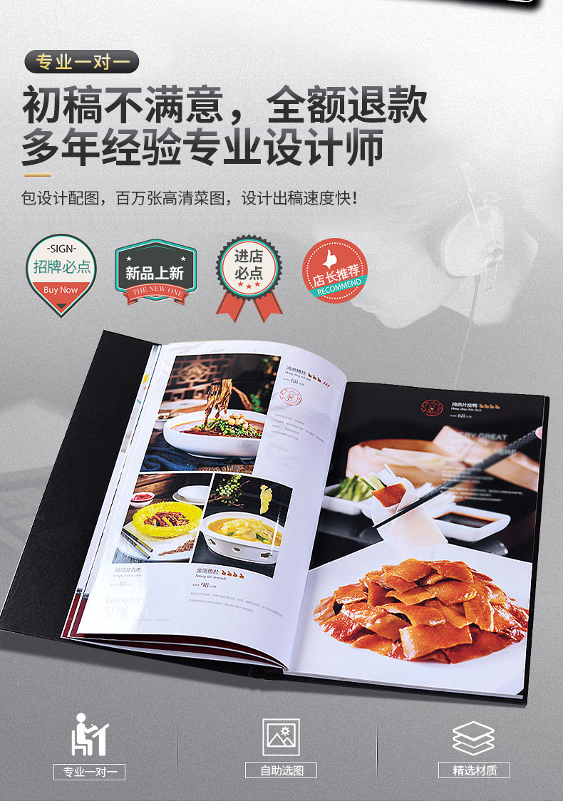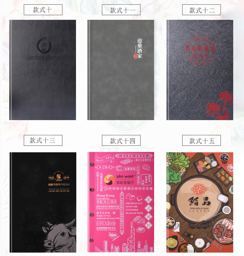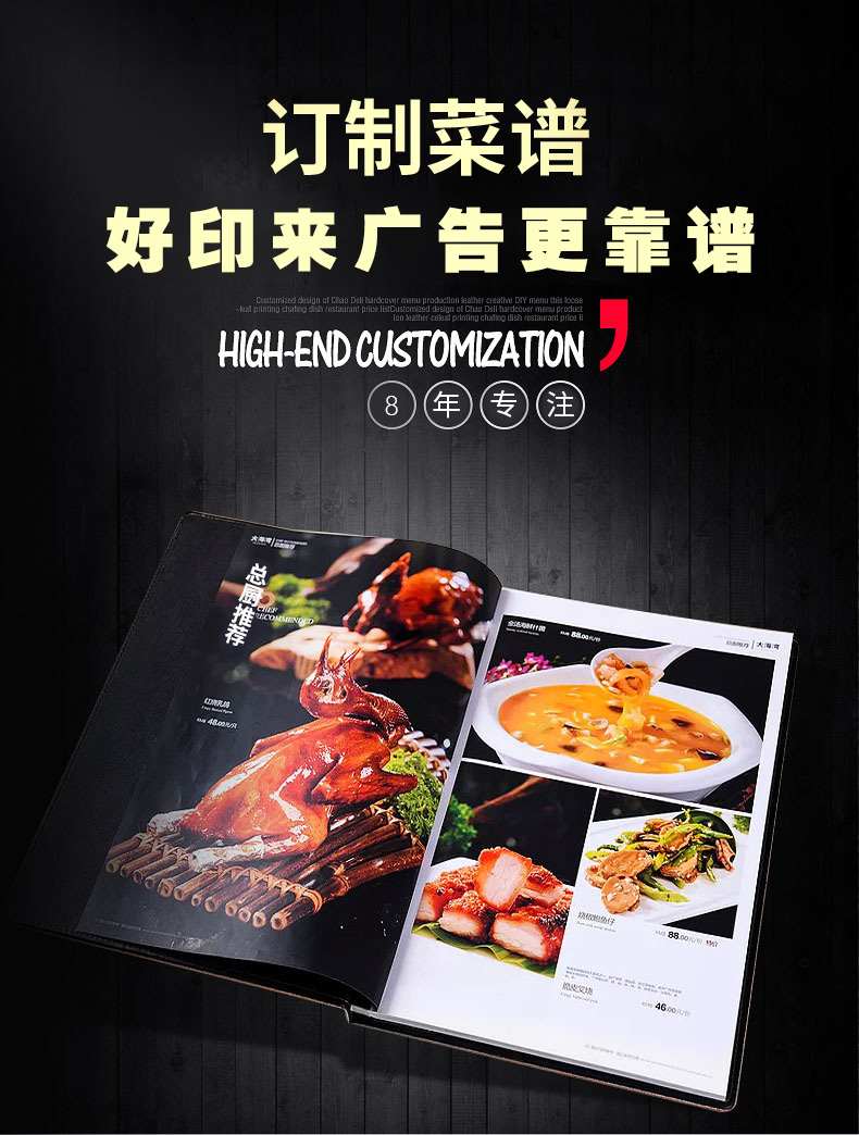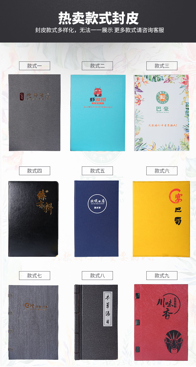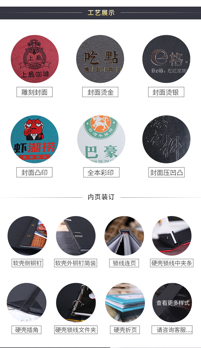 印品名稱(chēng):高檔皮革菜譜 可選工藝:雕刻封面 封面燙金 封面燙銀 封面凹凸 全體印彩 封面加凹凸 內頁(yè)裝訂:軟殼側銅釘 軟殼外銅釘簡(jiǎn)裝 鎖線(xiàn)連頁(yè) 硬殼鎖線(xiàn)中夾條 硬殼插角 硬殼鎖線(xiàn)文件夾 硬殼折頁(yè) 請咨詢(xún)客服..